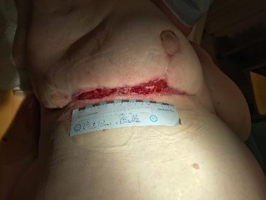 PICO◊ 14 System 15x20 cm in Kombination mit SECURA◊ reizfreier Hautschutz und ACTICOAT◊ FLEX 3 Wundauflage*. Im weiteren Verlauf Therapie ohne ACTICOAT◊ FLEX 3 Wundauflage und Umstellung auf PICO◊ 14 System 10x20 cm. Sobald die Wunde einen positiven Heilungsverlauf aufwies, wurde mit DURAMAX◊ Superabsorbierender Wundauflage und anschließend mit JELONET◊ Salbenkompresse weiterbehandelt.